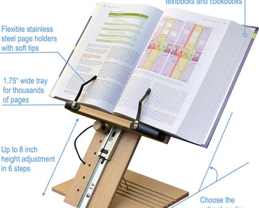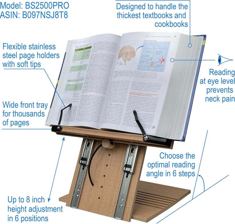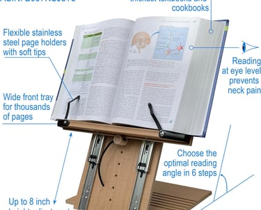 PATENT PENDING - BOOK STAND BS2500PRO WITH 8" HEIGHT ADJUSTMENT - Easily adjustable height and angle allow for setting the book to perfect eye-Level.